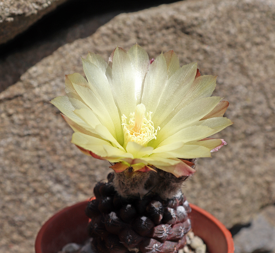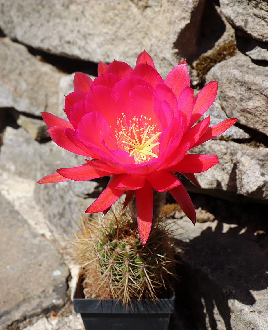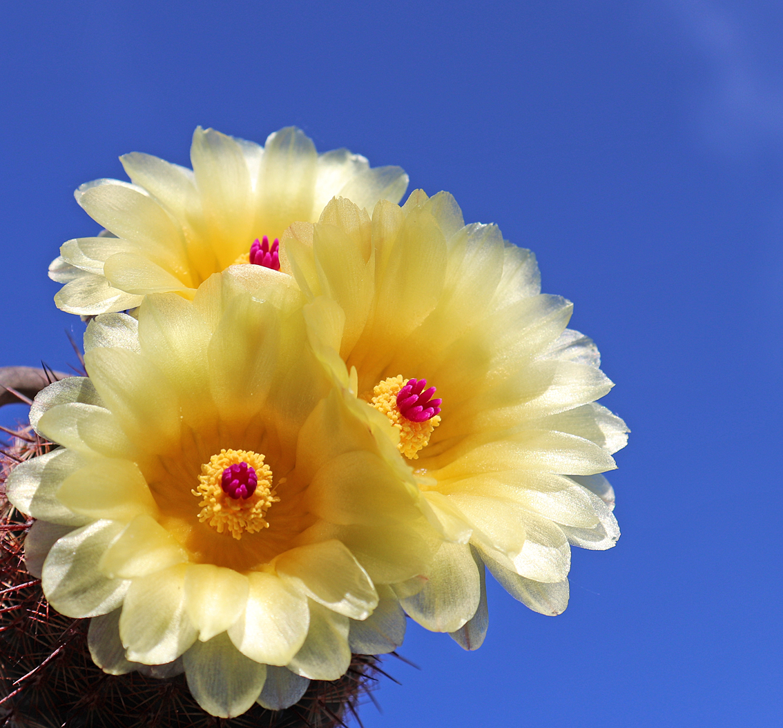 Ohne den Pflanztopf konnte ich das Foto vor einem strahlend blauen Himmel machen. Ihr wisst schon, Kakteen blühen auch ohne Substrat an den Wurzeln. Mittlerweile hat sich die Pflanze gut in ihrem neuen Topf eingerichtet. Das gibt wieder schöne Blüten - 2026.