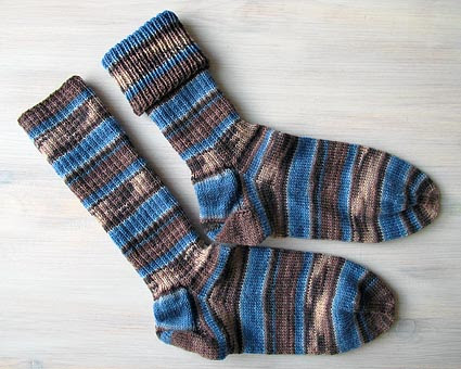 ..., das mir nicht so gut gelungen ist, führte zu diesem Paar. Der Uni-Braunton passte ungemein gut zum bunten Topas-Garn. Ich wollte mit zwischengesetzten Uniringeln ein wenig Struktur ins Gestrick bringen. Irgendwie hatte ich mir mehr davon versprochen. Vielleicht liegt es aber auch an dem glatt gestrickten Schaft? Es ist die gleiche Maschenanzahl, die ich sonst auch nutze, aber glatt rechts gestrickt sieht es aus wie für Elefantenbeine gestrickt. Doch was soll's? Hauptsache sie passen und das tun sie garantiert.